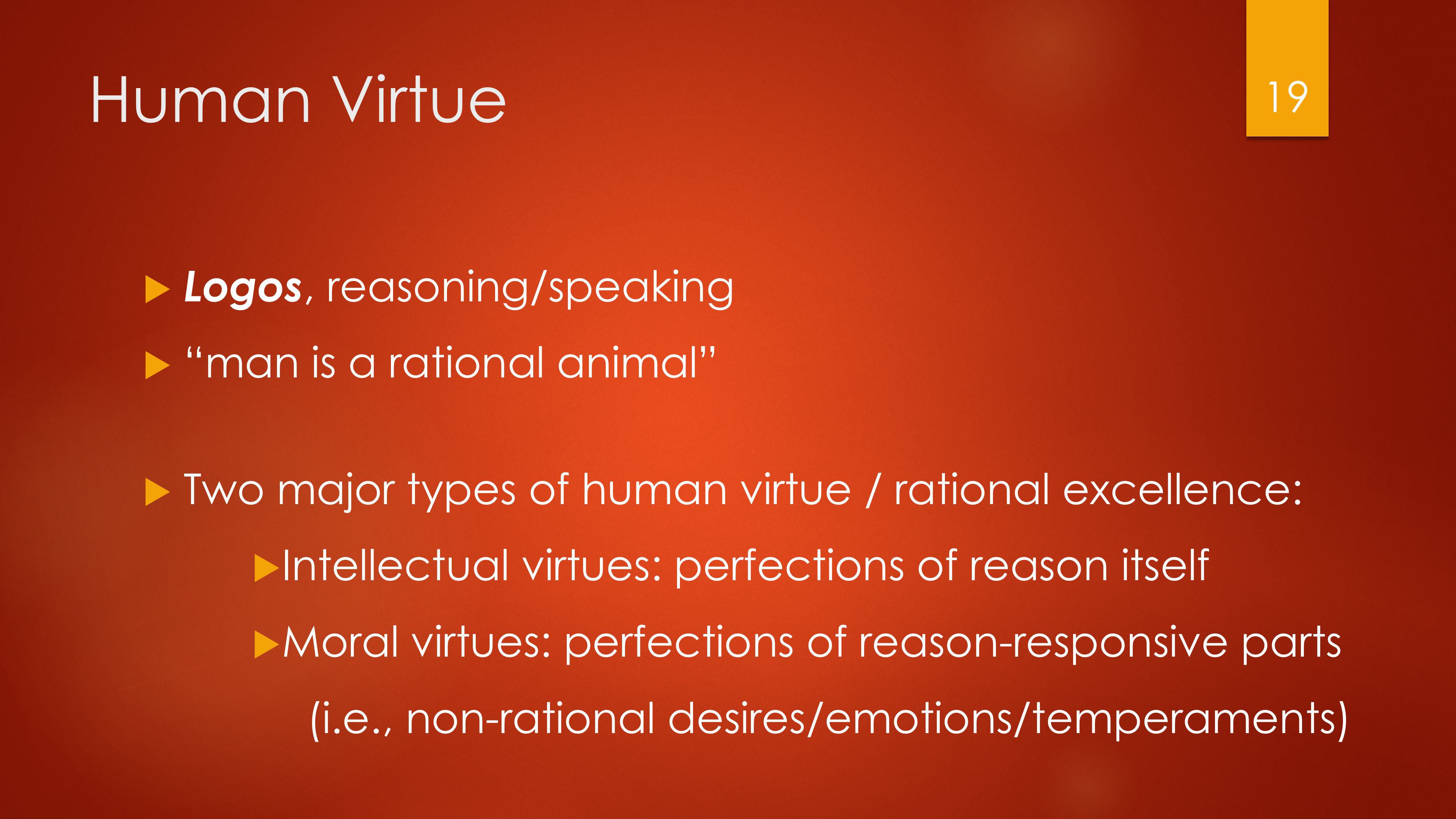 Virtues are perfections of our distinctively human powers of (1) reasoning and (2) mastering our emotions. The intellectual virtues are the perfections of reason itself, while the moral virtues are what lead to mastery of our emotions.