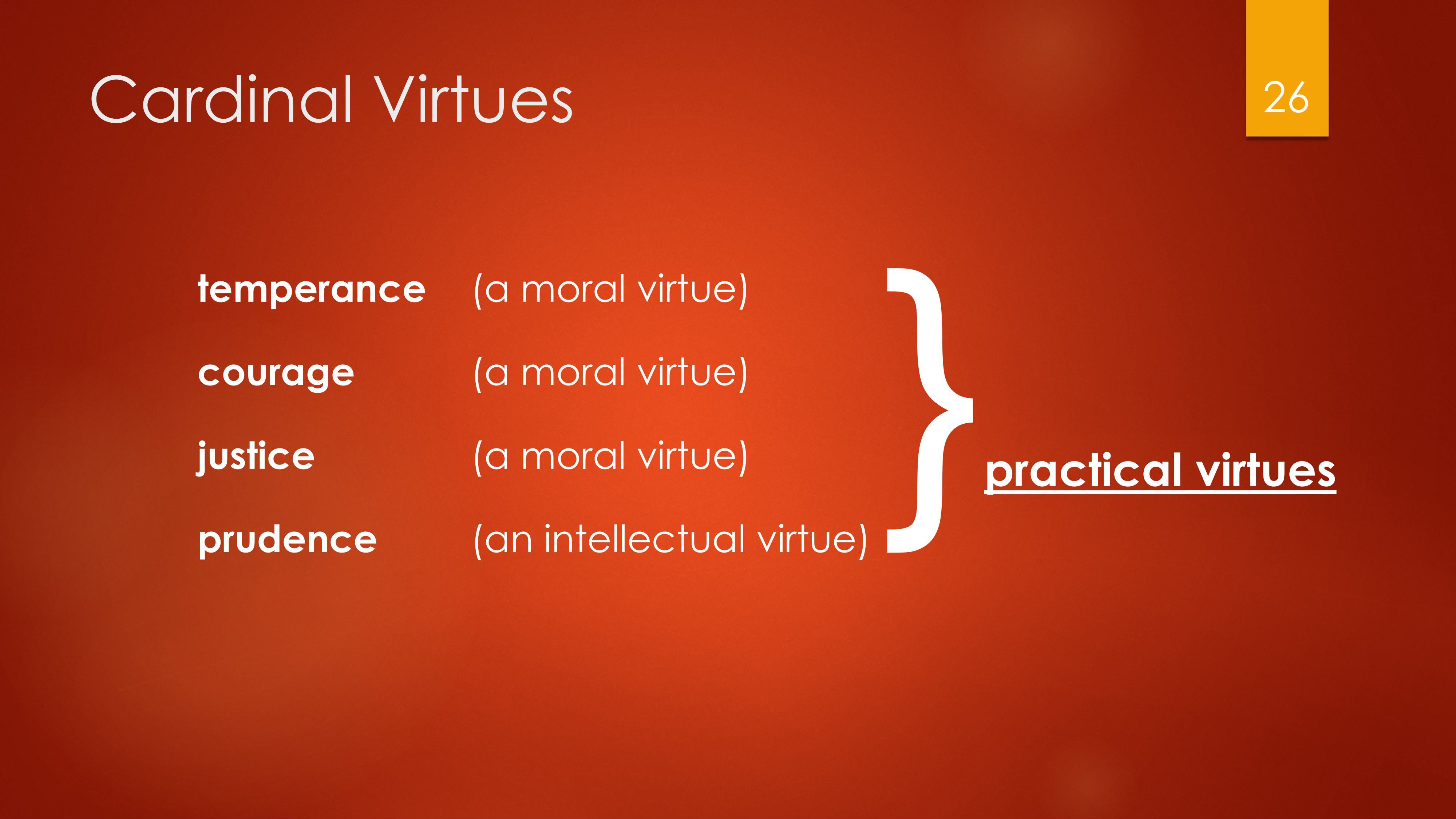 Justice, courage, and temperance (self-discipline) are the principal moral virtues. Prudence (practical wisdom) is an intellectual virtue concerned with living out the moral virtues in practical action. Collectively, the four are the practical virtues.