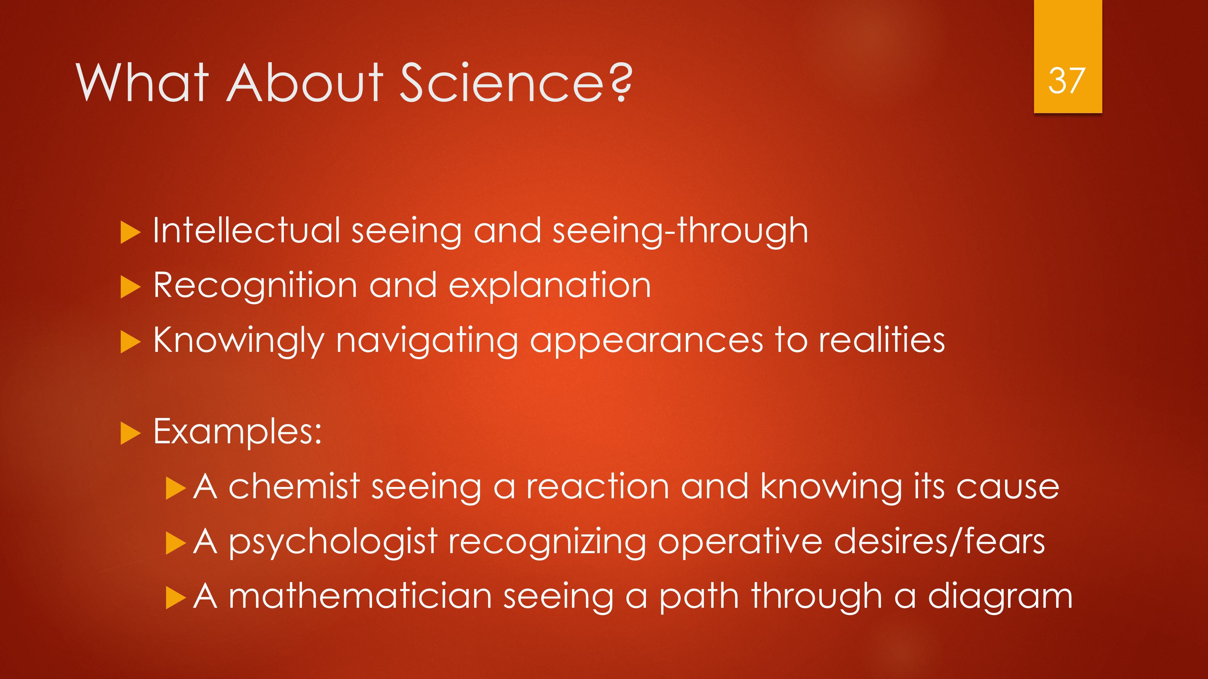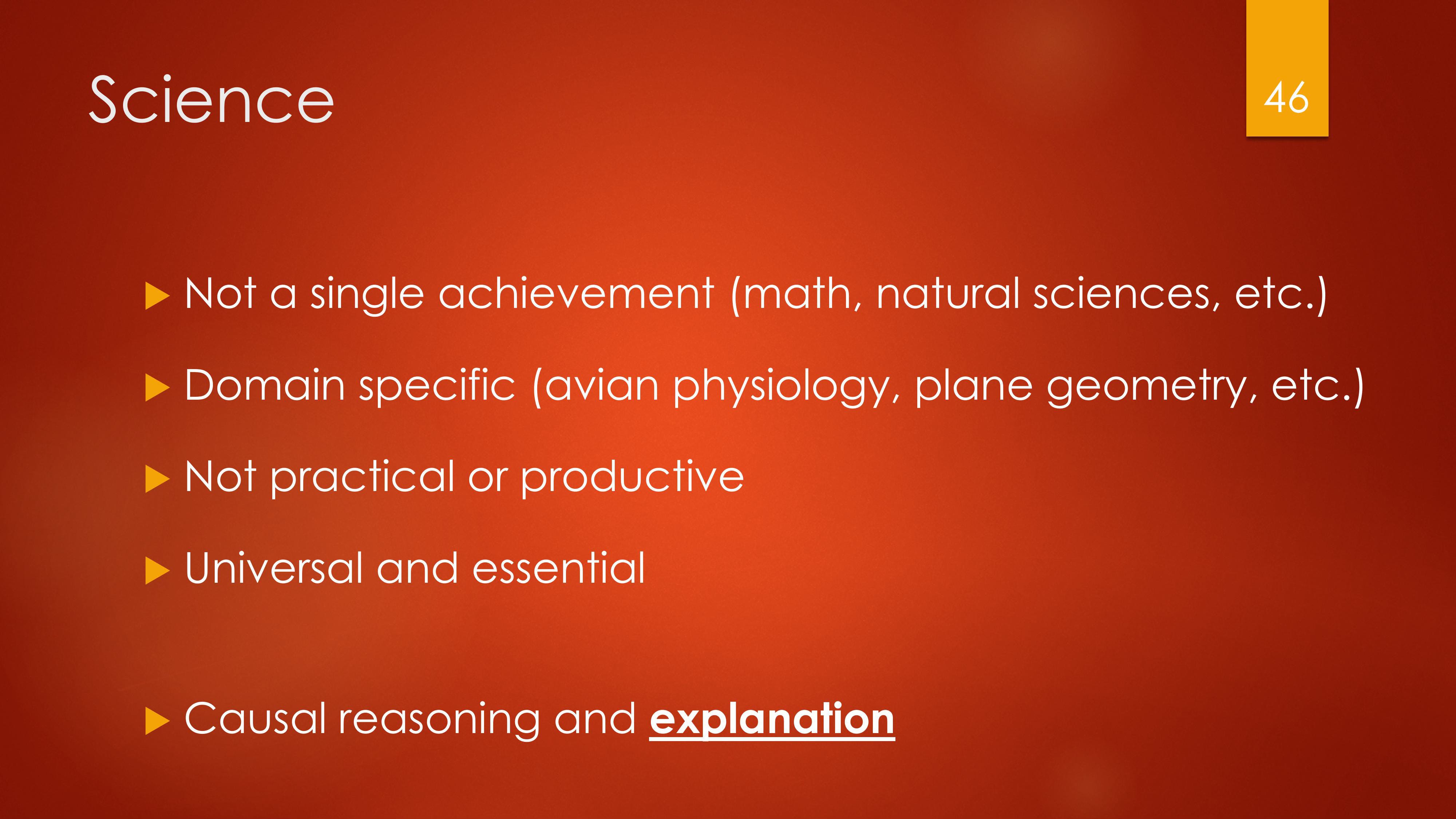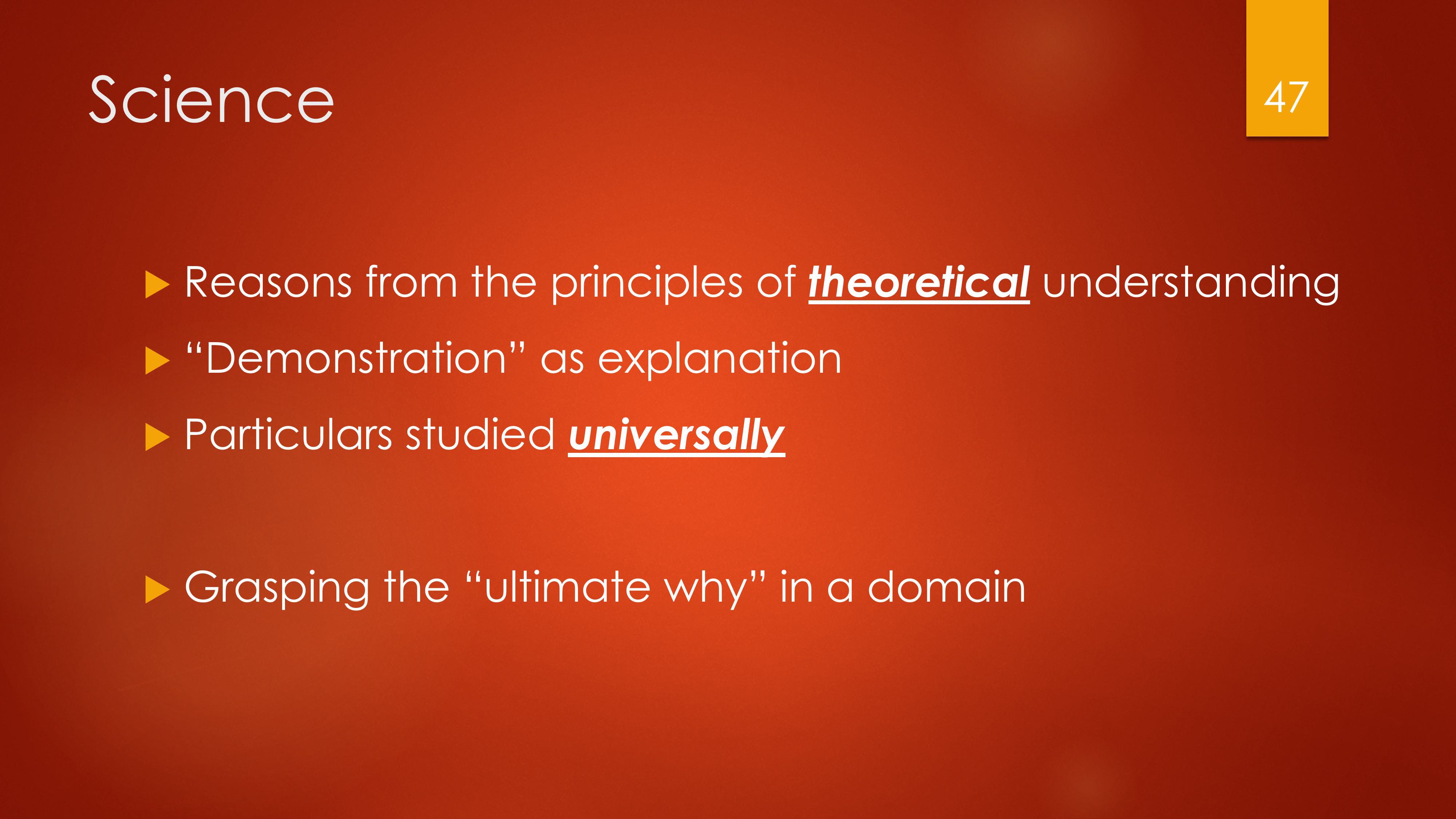 The virtue of science (which is related to but shouldn’t be confused with science as a body of knowledge, or the scientific method) is the habit of reasoning from principles to conclusions, but always always in explaining the causes of things. It is the ability to explain why something is so and not otherwise.2