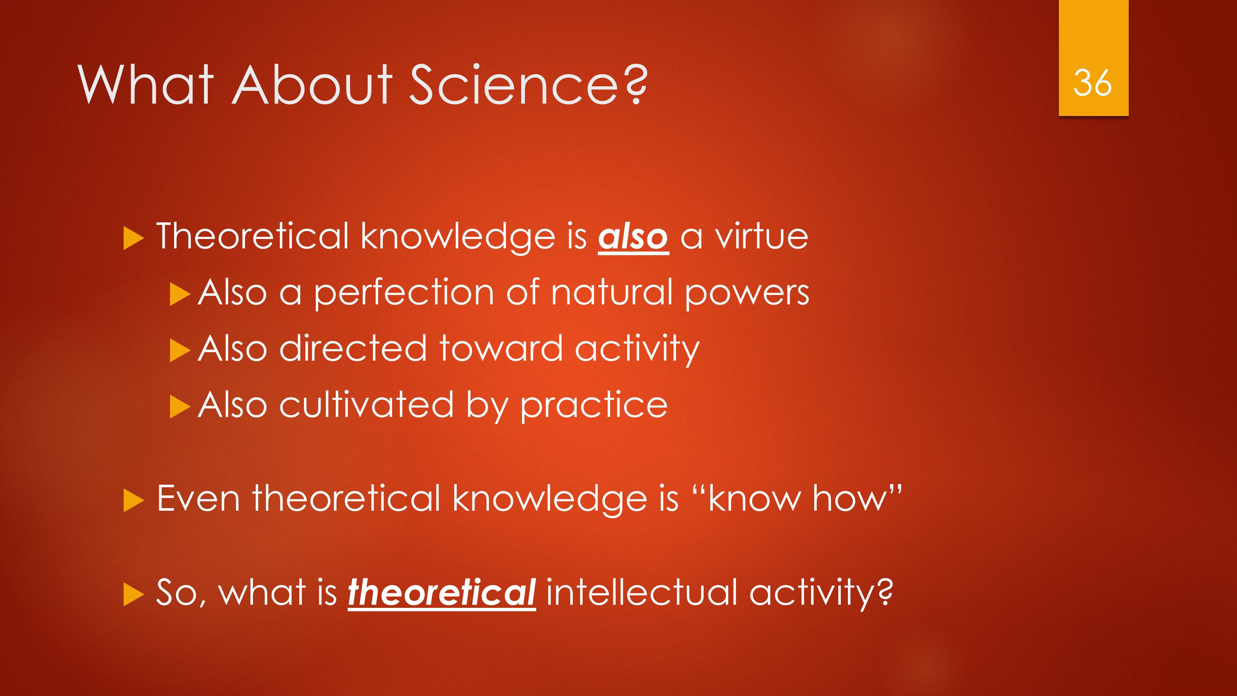 Theoretical knowledge is a virtue. Dr. Buttaci is not saying merely that knowledge is acquired through the exercise of virtue, but that knowledge itself is a virtue, a habit — a habit that perfects the human mind.