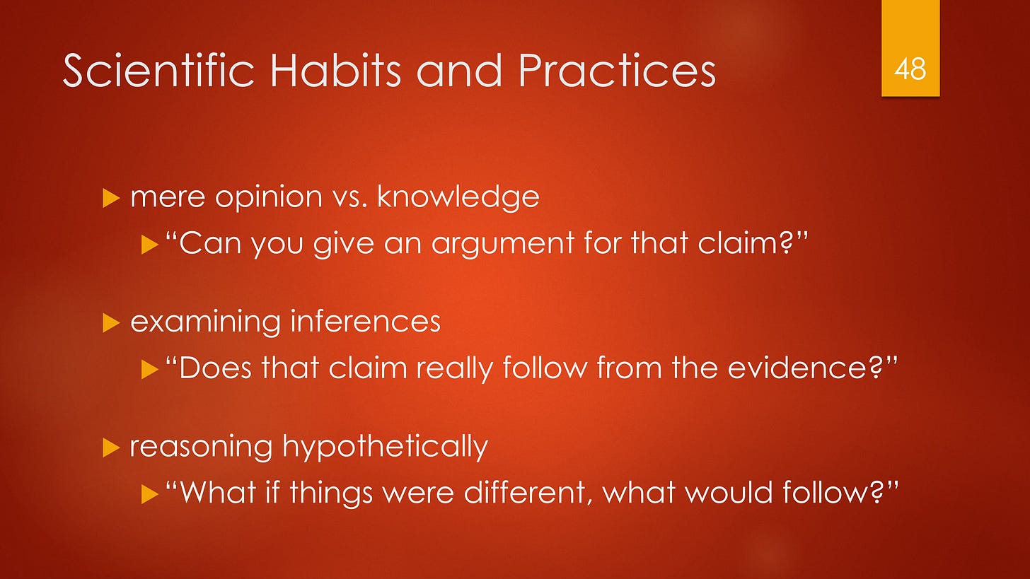 The virtue of science is developed by practicing, for example, distinguishing between knowledge and opinion, examining inferences, and reasoning hypothetically.