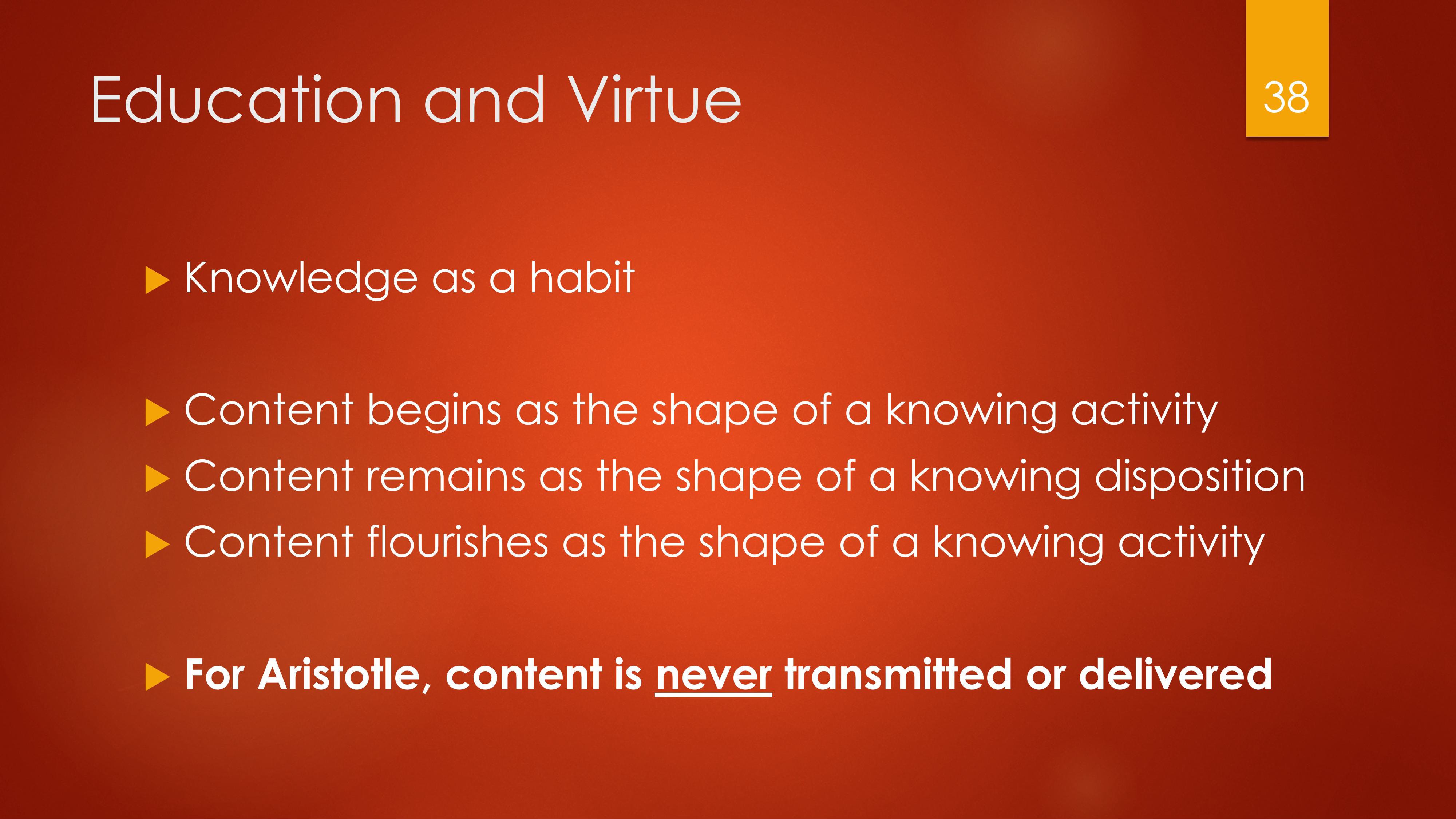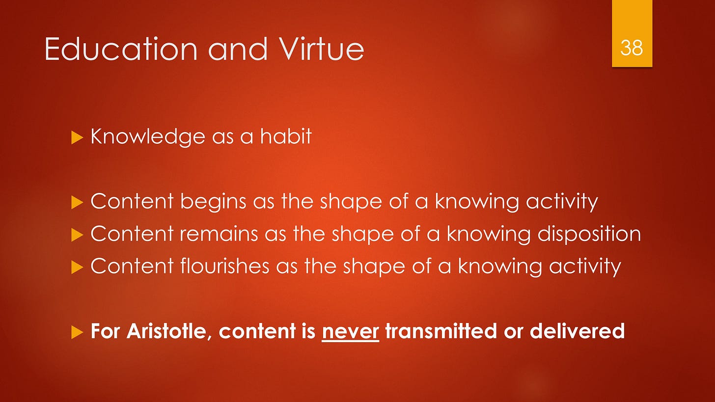 Even theoretical knowledge is a habit. Content is never really “transmitted” — content is rather the shape of a knowing activity that is cultivated in the student. Content — knowledge — is not like a book in your mind, it is more like a skill, a skill that equips the person to engage in a particular intellectual act.
