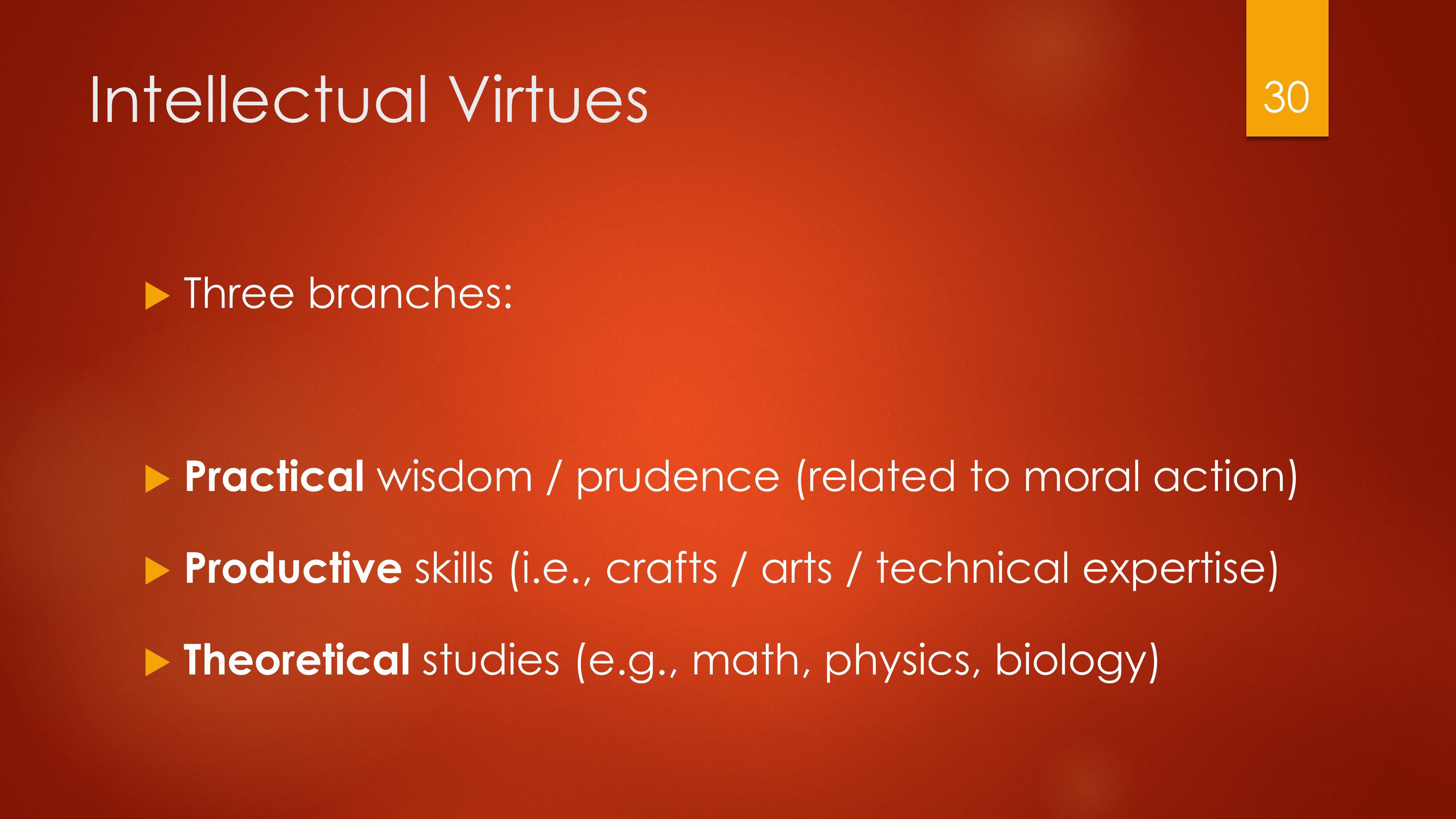 There are three branches to the intellectual virtues: practical, productive, and theoretical.