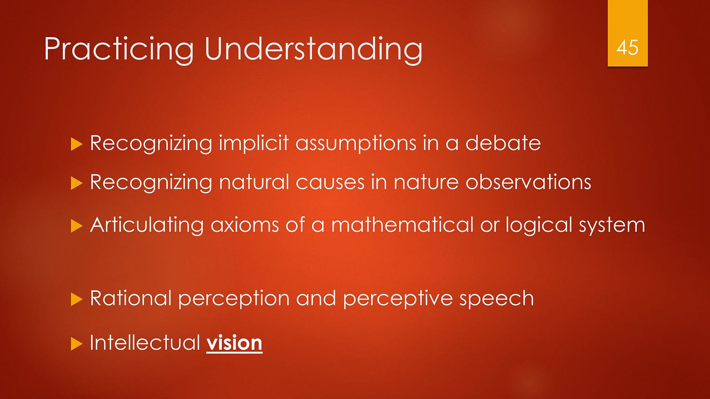 Students grow in the virtue — the habit — of understanding by practicing, for example, recognizing the implicit assumptions in a debate, recognizing natural causes in nature observations, or articulating the axioms of a mathematical or logical system.